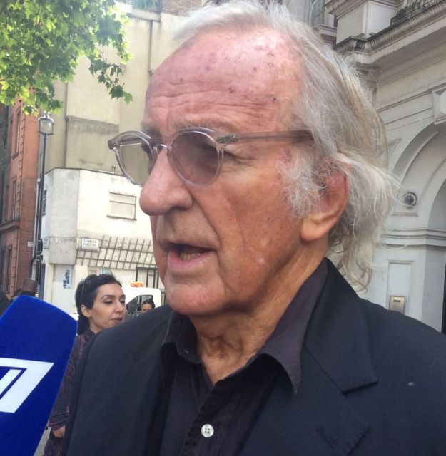 John Pilger, mahkeme salonunun dışında basına konuşurken