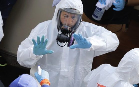Servpro temizlik işçileri, Kirkland, Washington’daki Yaşam Bakım Merkezi’nden çıkarken sprey sıkıyorlar; 12 Mart 2020 Perşembe. (AP Photo/Ted S. Warren)