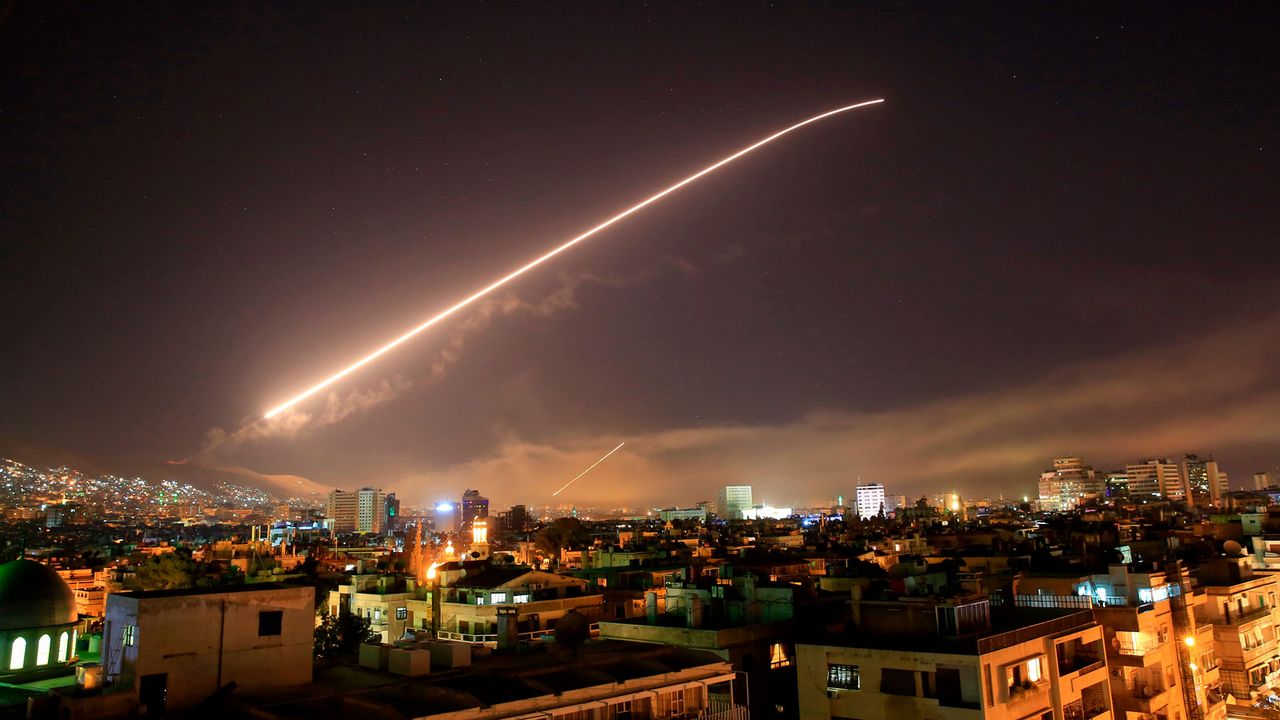 ABD’nin 14 Nisan 2018’de Suriye’nin Şam kentine düzenlediği saldırı. ABD Başkanı Donald Trump, hava saldırılarının Suriye’nin kimyasal silah kullanmasına misilleme olduğunu duyurmuştu. (AP Photo/Hassan Ammar)