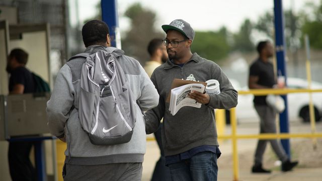 Michigan’daki Sterling Heights Montaj fabrikasında Otomotiv İşçileri Bülteni dağıtan bir WSWS destekçisi